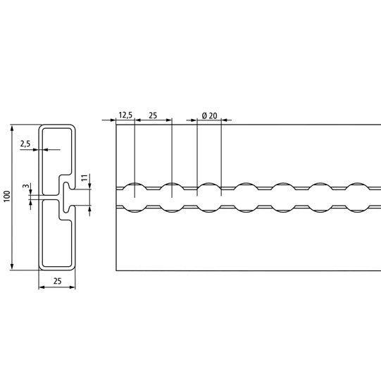 S-Line® Airline insertion profile 6001, 3600 mm long, aluminum anodised, 100 mm, suitable for insertion and stanchion pockets, compatible with combination spigot Ø 19/24 mm and all airline end fittings