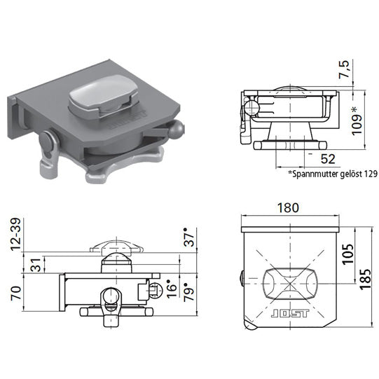Container locking device R 405 VAN, for swap bodies/trailers up to max. 25.4 t permissible gross container weight, back plate 180 x 70 mm, pivot Ø 52 mm (ISO), with locking ring, can be tensioned and lowered