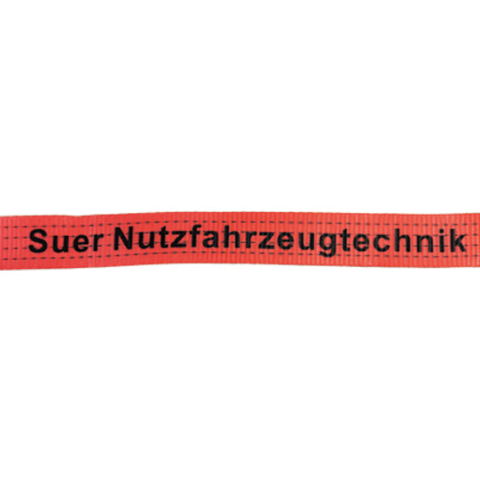 S-Line lashing strap 4036, 9 m, fixed end 0.5 m, loose end 8.5 m, two-part, with pressure ratchet R50E1 and double pointed hook 5002, fabric 50 mm, red with black imprint "Suer Nutzfahrzeugtechnik", LC 2000 daN in straight pull/4000 daN in strapping, STF 360 daN, elongation < 5 %, label sewn on the inside with protective film, manufactured and tested according to DIN EN 12195-2, GS and TÜV-tested