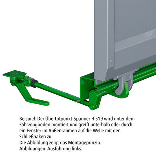 The H 519 top dead center tensioner is mounted under the vehicle floor and accesses the shaft with the locking hooks underneath or through a window in the outer frame.