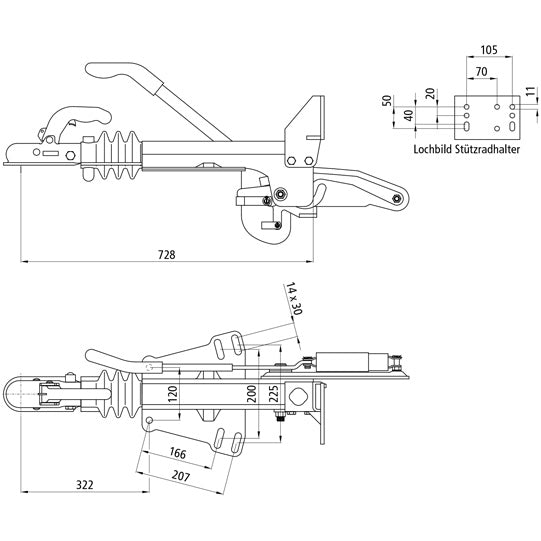 Overrun coupling for braked trailers KFG 35-D, with support wheel holder, 2700 - 3500 kg permissible total mass with V-drawbar/frame, ball coupling, with Vario bracket, can be mounted on or under the drawbar, maximum drawbar load 150 kg, hot-dip galvanized housing