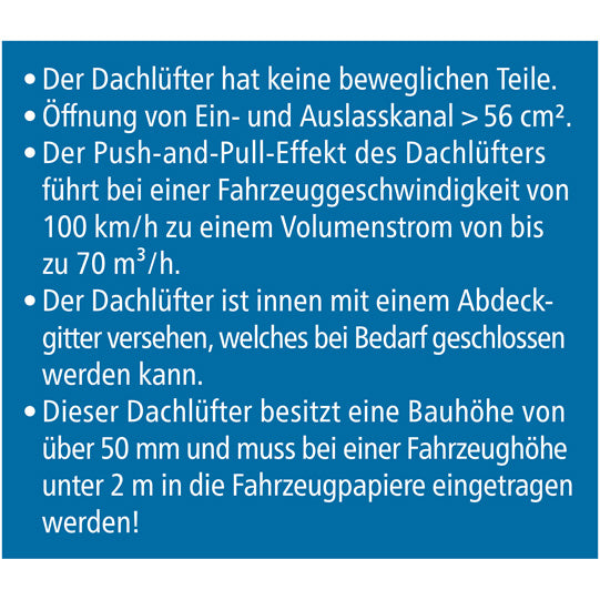 The roof fan removes unpleasant odors, moisture and gases or vapors and ensures a healthy working environment thanks to a powerful supply of fresh air.