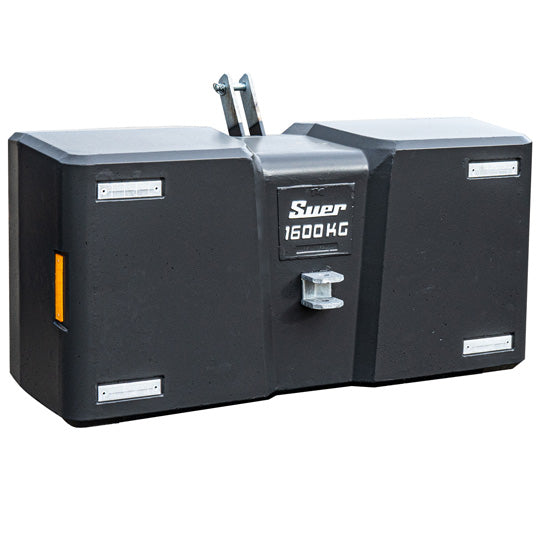 Suer SB1600 reinforced concrete weight, grey, for category II front hydraulic systems/rear hydraulic systems. Integrated reflectors orange at the sides, white at the front. With category II lower link mount hot-dip galvanized including lower link pins. Manoeuvring coupling and top link support hot-dip galvanized