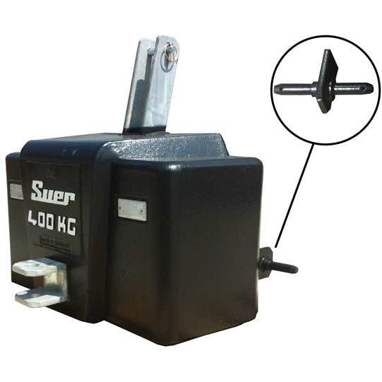 Suer reinforced concrete weight municipal SBKK, 400 kg, black, for front and rear hydraulic systems of category 0/I, integrated reflectors only at the front in white, screwable lower link pin, manoeuvring coupling and top link support hot-dip galvanized, 780 × 520 × 480 mm (w × d × h)