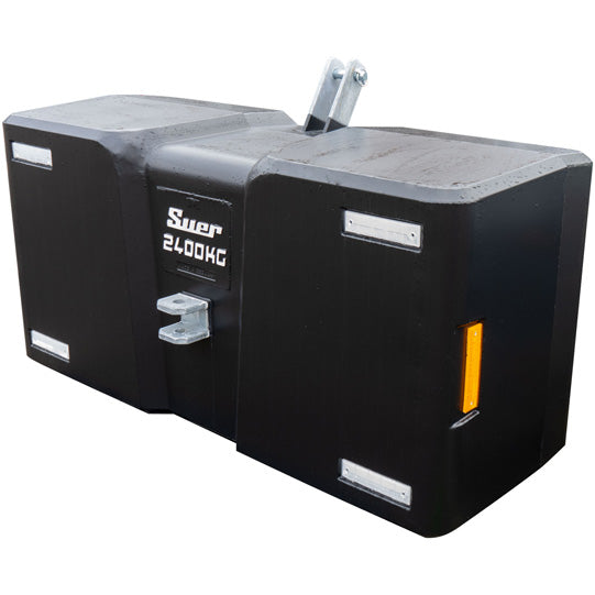 Suer heavy-duty concrete weight SM2400, black, for category II front hydraulic systems/rear hydraulic systems. Integrated reflectors orange on the sides, white on the front. With category II lower link mount hot-dip galvanized including lower link pin. Manoeuvring coupling and top link support hot-dip galvanized