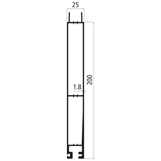 Alumiiniprofiili 25 mm pistokeliitäntään, 200 mm alaosa takatiivisteelle 111672, anodisoitu E6/C0 (EV1) -väriseksi, laakerin pituus 7500 mm