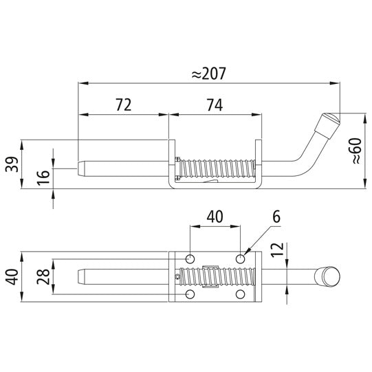 Jousisalpa ruuvattavalla levyllä, lukitusmekanismilla, ruostumatonta terästä, pitkällä pultilla