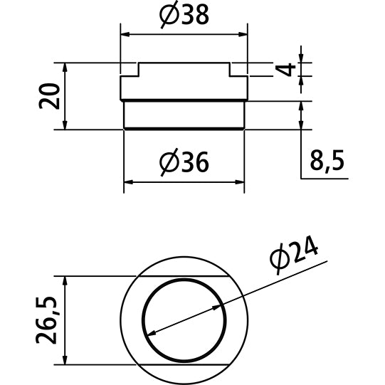 Hitsattava holkki, reikä 24 mm, ura 26,5 mm, ulko-Ø 38 mm, olkapää Ø 36 mm