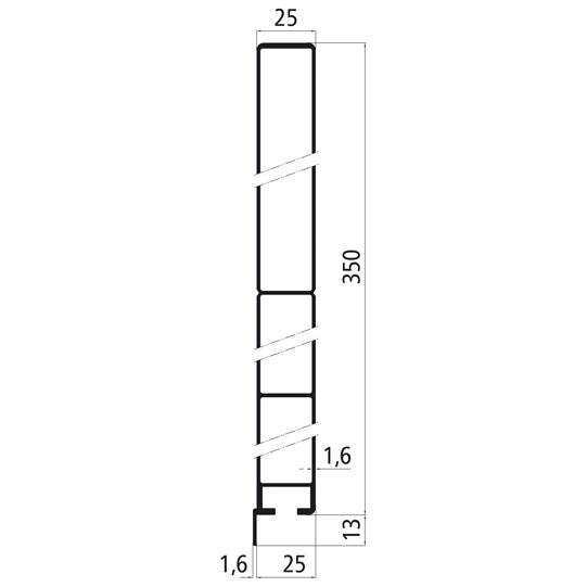 Aluminiumprofil 25 i ett stycke, 350 sidobräda med flagga, anodiserad i E6/C0 (EV1) naturfärg, 7500 mm lagerlängd