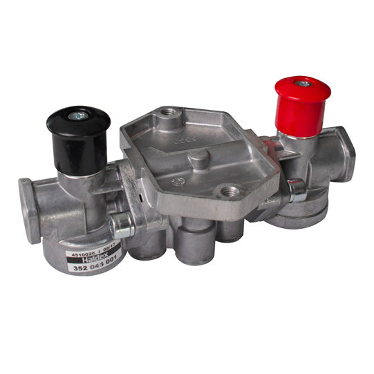 Dubbelutlösningsventil/kombinationsventil, manuell manövrering, anslutning M16 x 1,5, max. driftstryck 8,5 bar, med backventil i anslutning 11 och informationsskylt, (original Haldex 352045001)