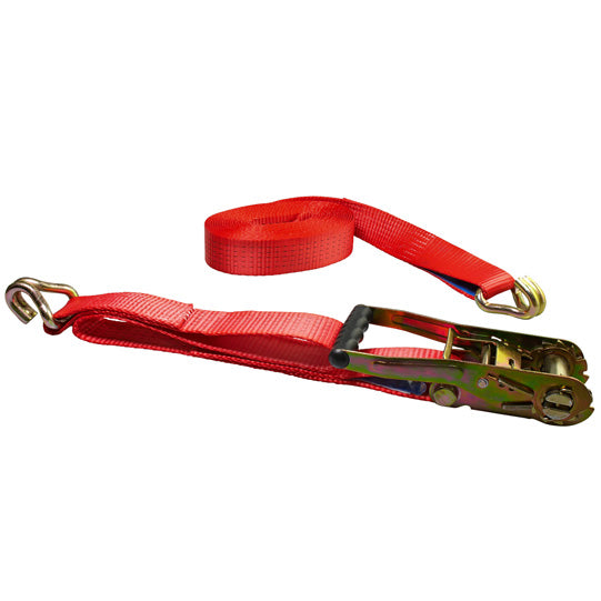 S-Line surrningsband 5035, 8 m, fast ände 1 m, lös ände 7 m, tvådelad, med spärrhake R50E1 och dubbelförskjuten spetskrok 5013, 50 mm tyg, röd, LC 2500 daN i rakt drag/5000 daN i bandning, STF 350 daN, töjning < 5 %, etikett påsydd med skyddsfilm på insidan, tillverkad och testad enligt DIN EN 12195-2, GS- och TÜV-testad