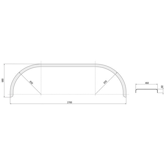 StänkskärmD ALQ46270 (rund form), schackrutig aluminiumplåt 2,5/4 mm, kantskydd svetsat på 3 sidor, 460 × 3510 × 680 × 650 × 2700 mm (b × l × h × b × s)