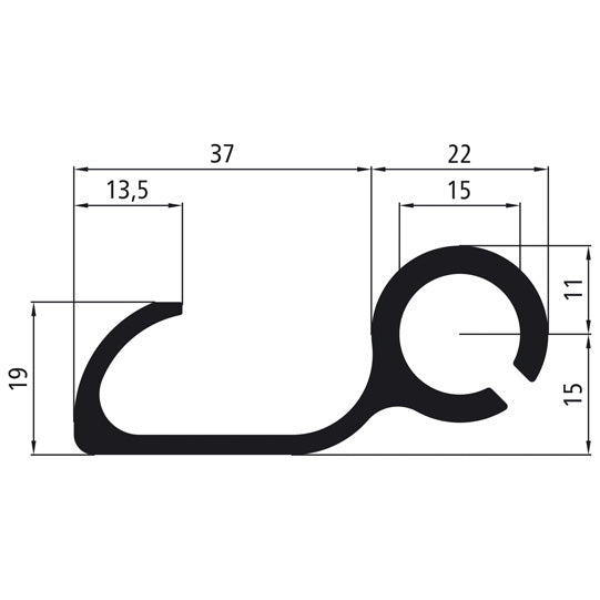 Presenningsspännkrok i aluminium, rå, framåtkrokande, EN AW-6063 T66, längd 3300 mm